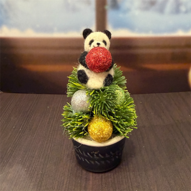 森の中で、今日もパンダたちが元気いっぱい! タイヤブランコでくるんと揺れる子、木の上からひょっこりのぞく子、 幹の根元にちょこんと隠れている子まで、それぞれの遊び方で過ごす自由な時間。 中央のタイヤブランコに乗っているパンダは自由に向きを変えて飾ることができます。 「こっちを見てる」「後ろ姿が見える」など、見る角度で雰囲気が変わるのもこの作品の魅力。 木箱のケースにはアクリルの蓋が付いているため、飾るときにホコリが気になる方にも安心です。 蓋を外せば、羊毛ならではのふんわりとした優しい質感をそのまま楽しんでいただけます。 【サイズ】高さ約16cm × 幅約16cm × 奥行約8cm
