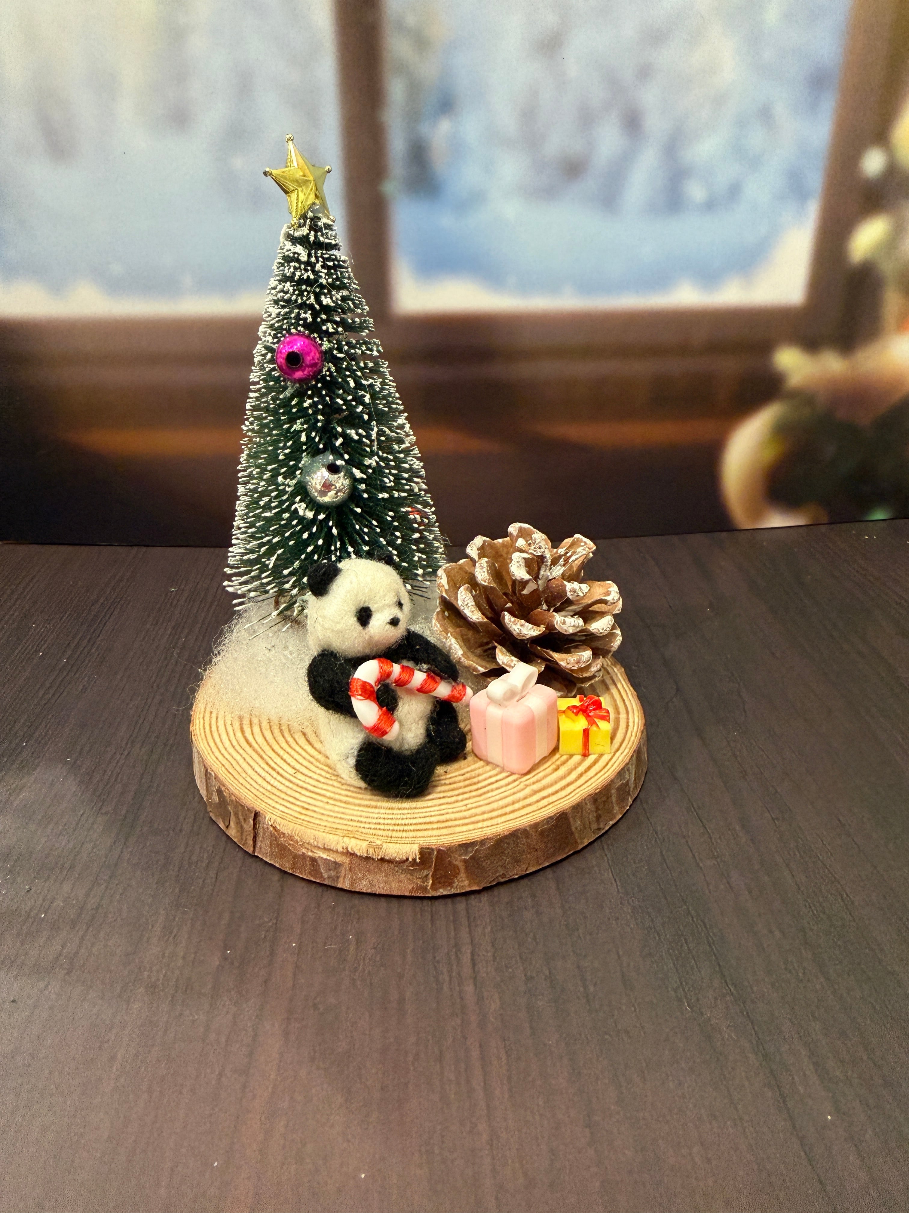 松ぼっくりに積もる雪、キラキラ輝くツリー、そしてキャンディケーンを抱えてのんびり座るパンダ。