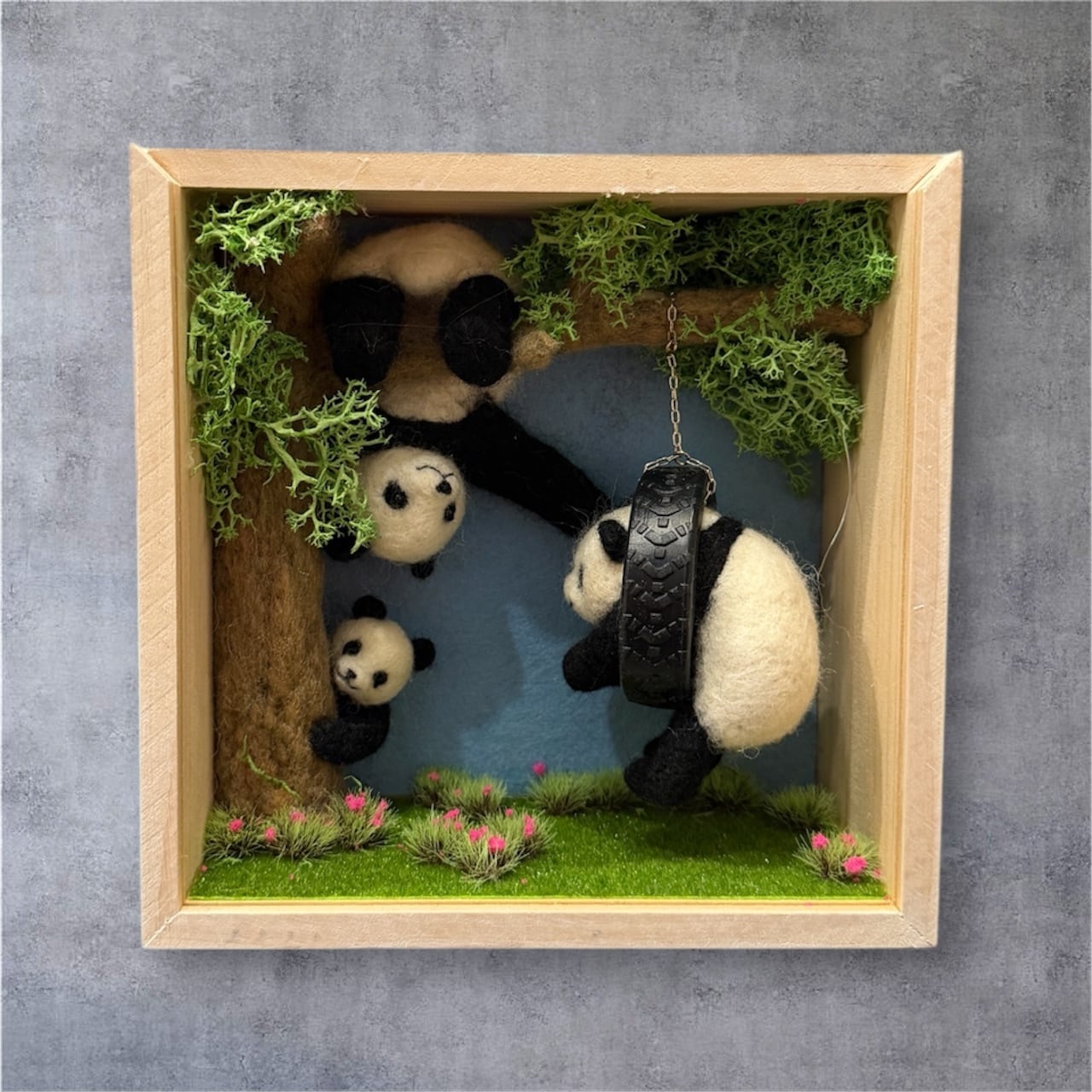 中央のタイヤブランコに乗っているパンダは自由に向きを変えて飾ることができます。